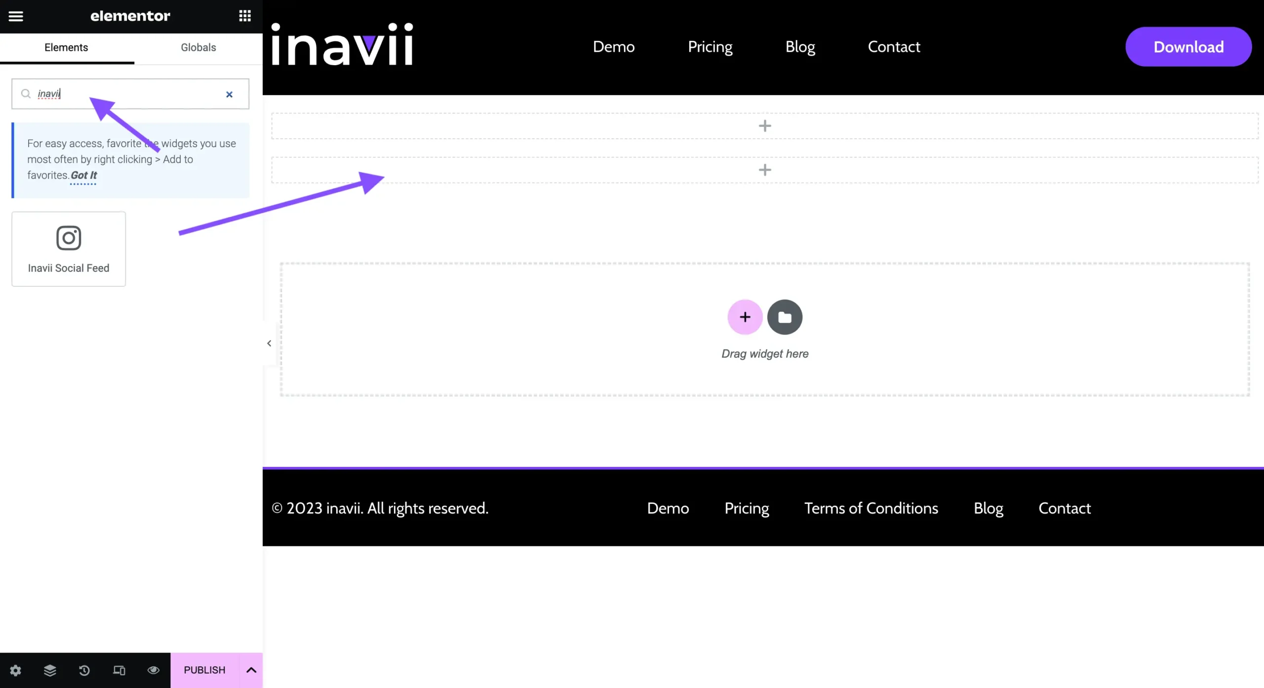 1. Go to your page and use edit with Elementor functionality. Search for Inavii Social Feed for Elementor and just simply drag and drop our Inavii Social Feed for Elementor into the specific section