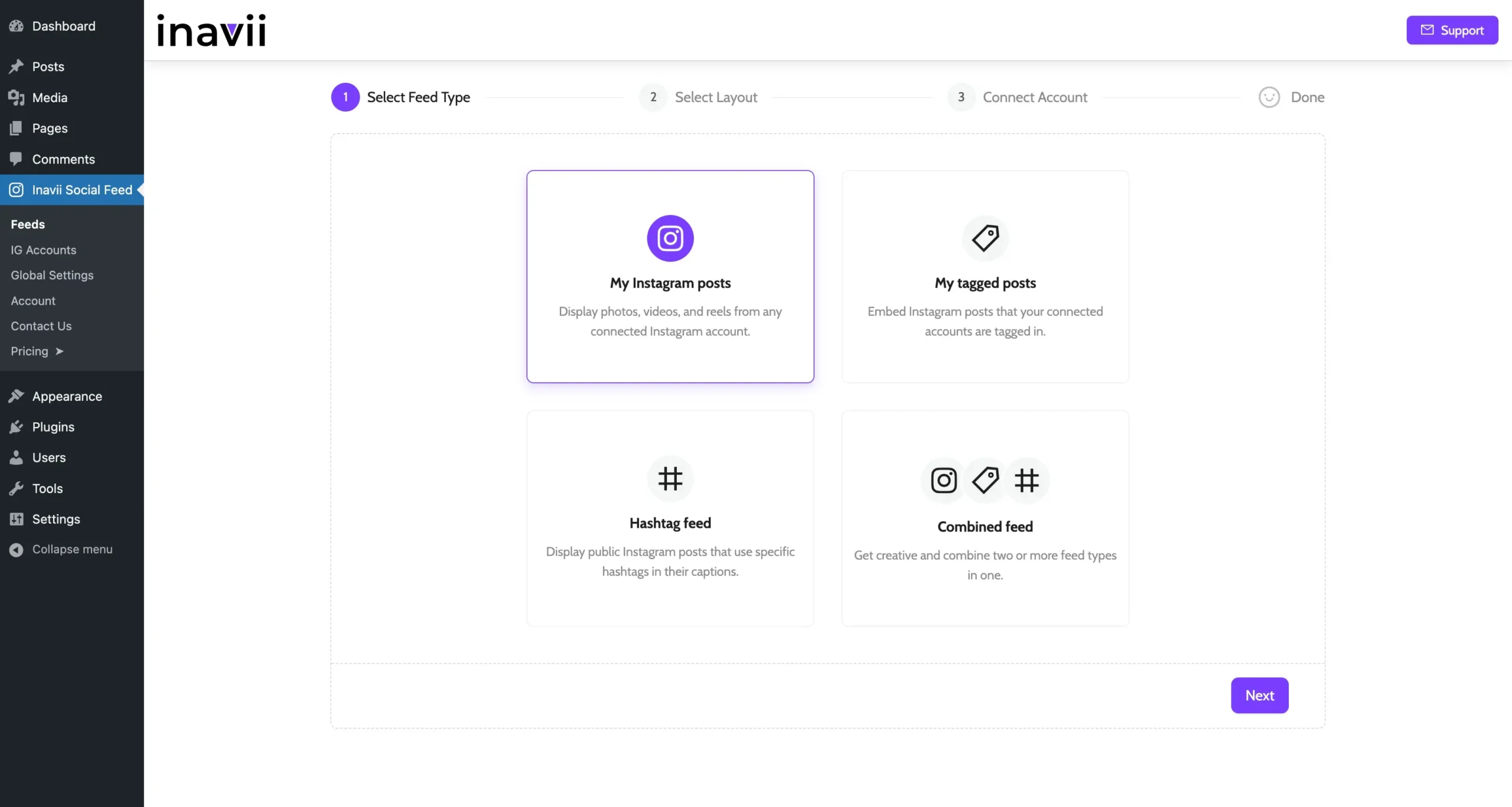 After installing Inavii Social Feed, navigate to the Inavii Social Feed page via the left-hand side menu on your WordPress site’s Dashboard.